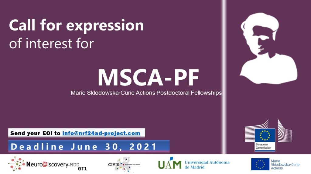 If you are interested in applying for a MSCA Postdoctoral Fellowship (MSCA-PF) with the NeuroProtectionLab-UAM as host institution, you must send an “Expression of Interest (EOI)” to info@nrf24ad-project.com before 30th of June!
