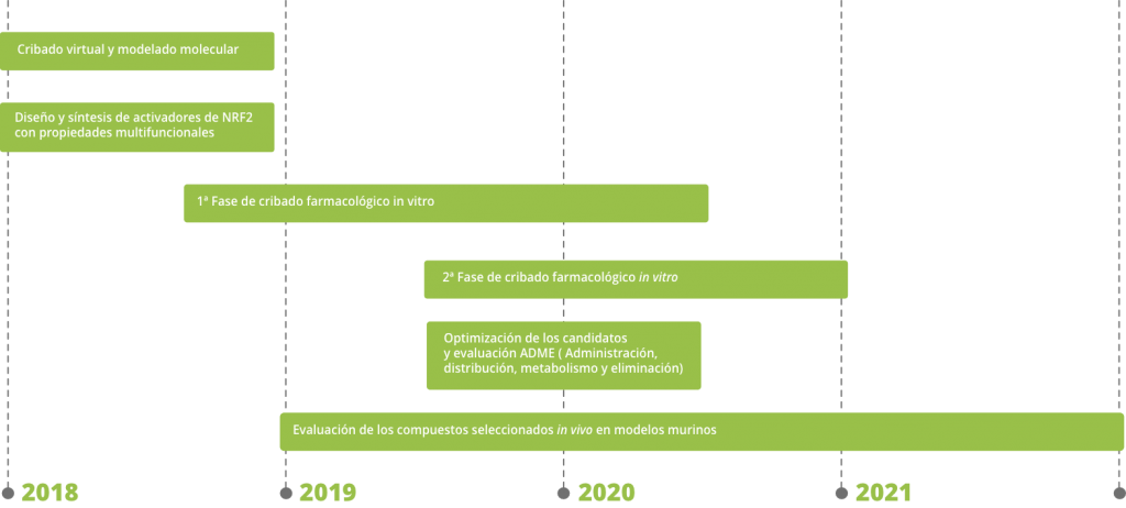 In this context, the NRF24AD project aims to identify and develop a new neuroprotective drug for the treatment of AD that promotes the endogenous defenses through the activation of the transcription factor NRF2. By this way we pretend to enhance the capacity of the body to avoid / diminish / mitigate the appearance of this disease, instead of treating only its consequences.
